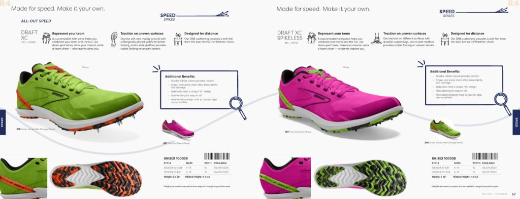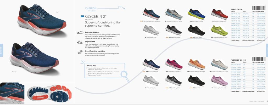 Cover of the Speed Shoes spread introducing the new Hyperion Elite 4 running shoeProduct detail page for Draft XC speed shoes from Brooks Spring 2024 Footwear CatalogProduct detail page explaining product benefits and features of the new Glycerin 21 running shoes