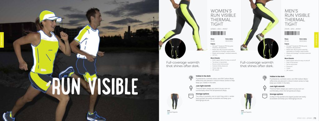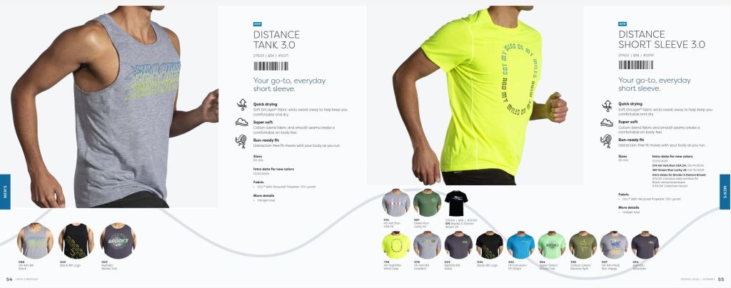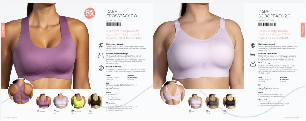 Section cover page for Run Visible Collection from Brooks Spring 2024 Apparel CatalogProduct detail page explaining product benefits and features of the Dare running bras collectionProduct detail page describing the new assortment of Distance 3.0 performance running tops